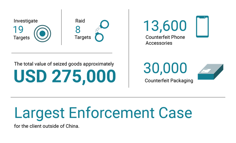 Rouse represented this client in its biggest-ever raid in the Philippines. Rouse completed an investigation against 19 targets, and raided 8 selected targets on the same day, seizing almost 13,600 counterfeit phone accessories and more than 30,000 counterfeit packaging in 5 locations. This sent a strong deterrent message to the local counterfeit network. The total value of seized goods was approximately USD 275,000 and was the largest enforcement case for the client outside of China.